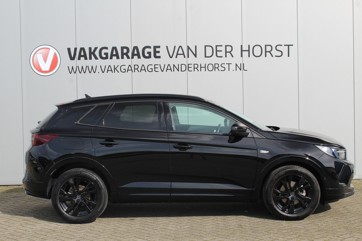 Opel Grandland 1.2-130pk Turbo GS-Line. Zeer nette, sportieve en luxe hoogzitter, slechts 49.000km ! Autm. airco dual, camera, half leder, navigatie, telefoonvoorb, Apple carplay/Android auto, lane- en side assist, cruise control, metallic lak, LM wielen etc.