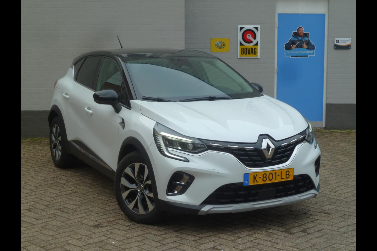 Renault Captur 1.3 TCe 140 Intens Automaat uit 2021, een comfortabele en krachtige SUV met een zeer complete uitrusting en een moderne uitstraling. Uitgevoerd in metallic wit met zwart dak en zwarte accenten, wat zorgt voor een sportieve en luxe look.