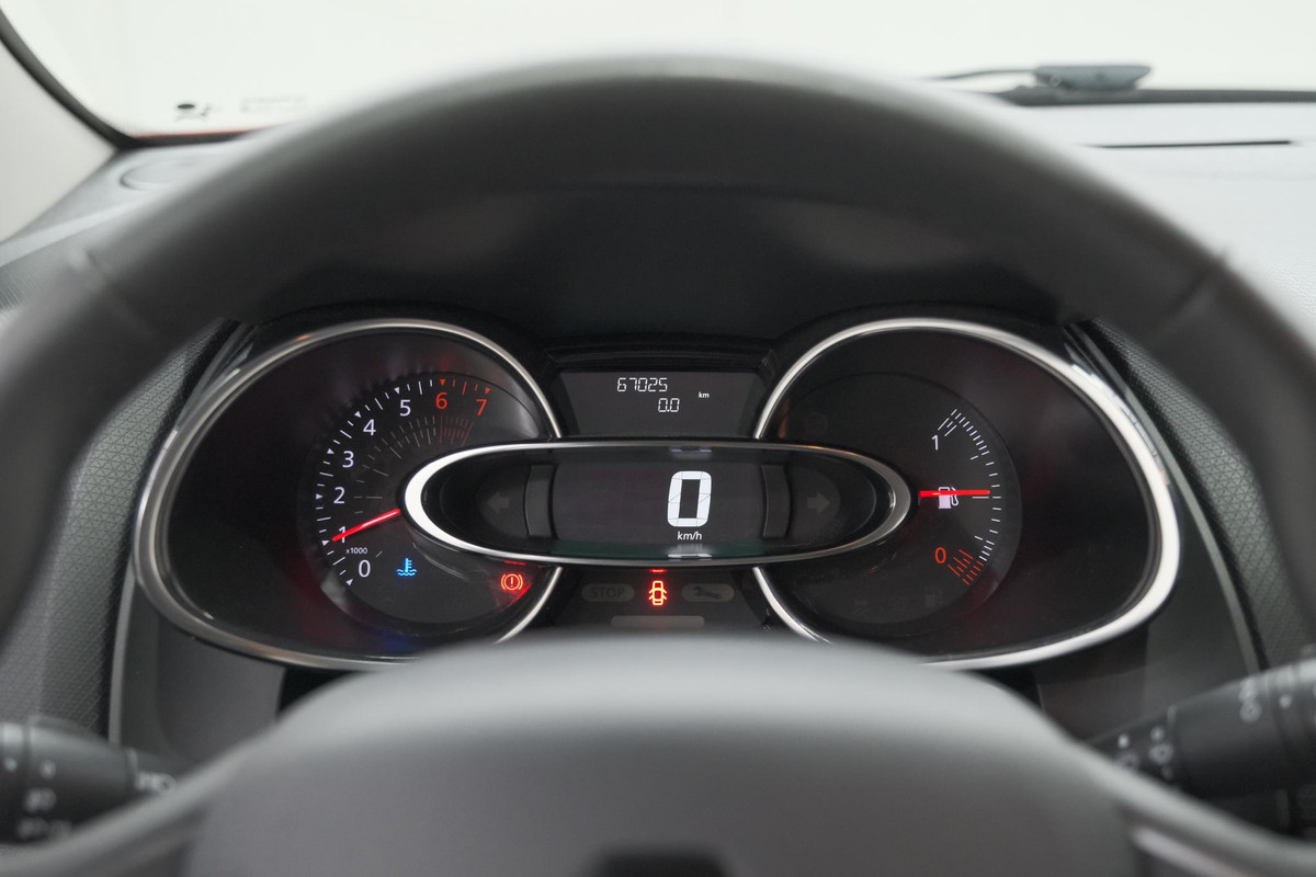 Als u regelmatig met een aanhanger of een fietsendrager op pad bent, is de afneembare trekhaak een praktische extra. In deze Clio vindt u schakelaars op het stuur om het full map navigatiesysteem te bedienen en het audiosysteem met DAB-ontvangst. Omdat u nu eenmaal niet overal ogen heeft, is deze Renault Clio voorzien van een achteropkomend verkeer waarschuwing die registreert wanneer de afstand tot uw achterligger te krap is. Parkeersensoren helpen u tijdens het in- en uitparkeren. Lange stukken vermoeiend? Niet met de cruise control! De uitrusting van deze Renault is met keyless entry, airconditioning, buitentemperatuurmeter, lederen stuur, centrale deurvergrendeling met afstandsbediening en boordcomputer behoorlijk compleet.