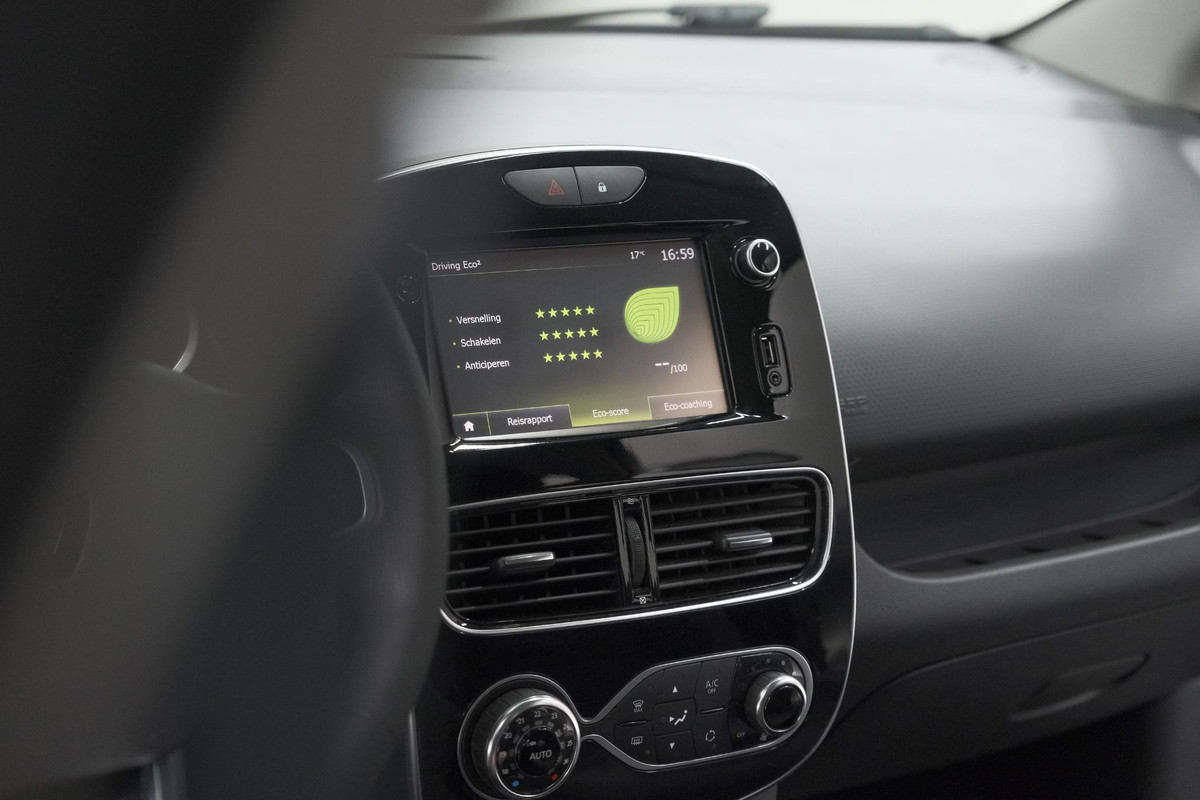 U kunt tijdens de rit uw ogen steeds op de weg houden, want het audiosysteem (met dab!) en het full map navigatiesysteem kunt u bedienen vanaf het stuur. Te weinig afstand tussen u en de achterligger? De sensoren registreren het direct en de achteropkomend verkeer waarschuwing geeft een signaal. Met automatische airconditioning hoeft u alleen de gewenste temperatuur in te stellen. Het systeem doet de rest. Een plekje vinden in de binnenstad is één, inparkeren is twee. Voor dat laatste heeft deze Renault Clio prima parkeersensoren die u een handje helpen. Achter het stuur van deze Renault bent u niet alleen. De auto kijkt als het ware met u mee tijdens de rit. De regensensor schakelt de ruitenwissers in als het nodig is en de automatisch inschakelbare verlichting doet de lichten voor u aan. Met cruise control, buitentemperatuurmeter, centrale deurvergrendeling met afstandsbediening, boordcomputer en verstelbaar stuur is deze Renault helemaal compleet.