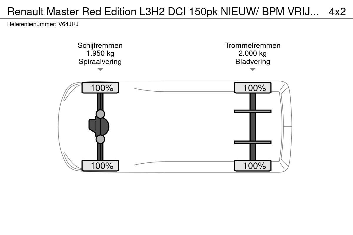 Vooras: Max. aslast: 1950 kg; Bandenprofiel links: 100%; Bandenprofiel rechts: 100%; Remmen: schijfremmen; Vering: spiraalvering