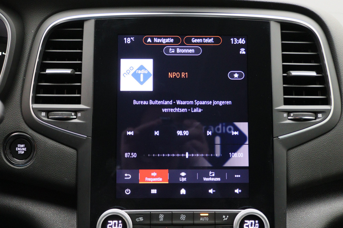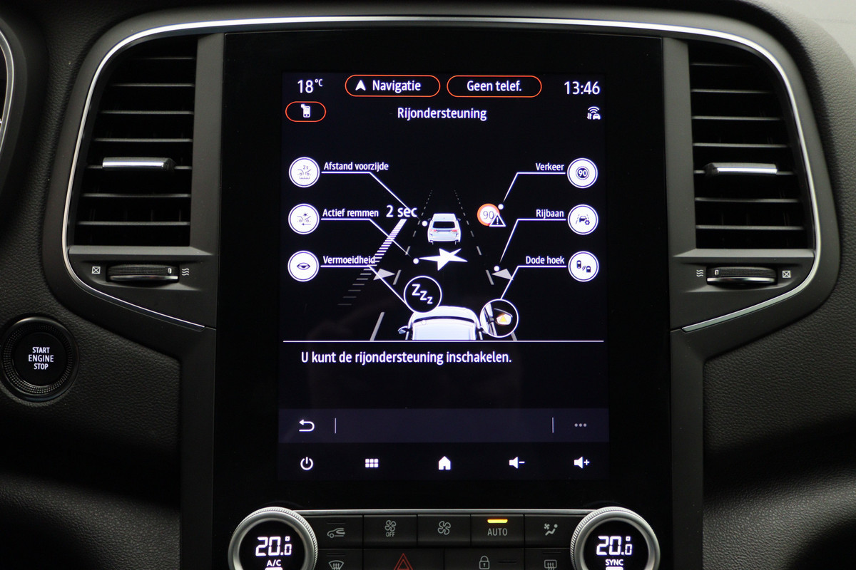 De achteruitrijcamera vergemakkelijkt achteruit inparkeren. U ziet duidelijk wat er achter de auto gebeurt. Voor een veilige rit is het belangrijk dat uw handen het stuur vasthouden en uw ogen gefocust blijven op de weg; daarom kunt u het audiosysteem, met DAB-ontvangst en full map navigatiesysteem bedienen met het stuurwiel of via spraakbediening. Natuurlijk is er ook automatische airconditioning aanwezig. Om de veiligheid onderweg te verhogen, heeft deze Renault zowel een automatisch inschakelbare verlichting als een regensensor aan boord, zodat hij zelf de verlichting en de ruitenwissers kan inschakelen. Cruise control is aanwezig; prettig voor de lange einden. De Renault is standaard voorzien van: keyless entry, automatisch dimmende binnenspiegel, lederen stuur, isofix-aansluiting, usb-aansluiting en centrale deurvergrendeling met afstandsbediening.