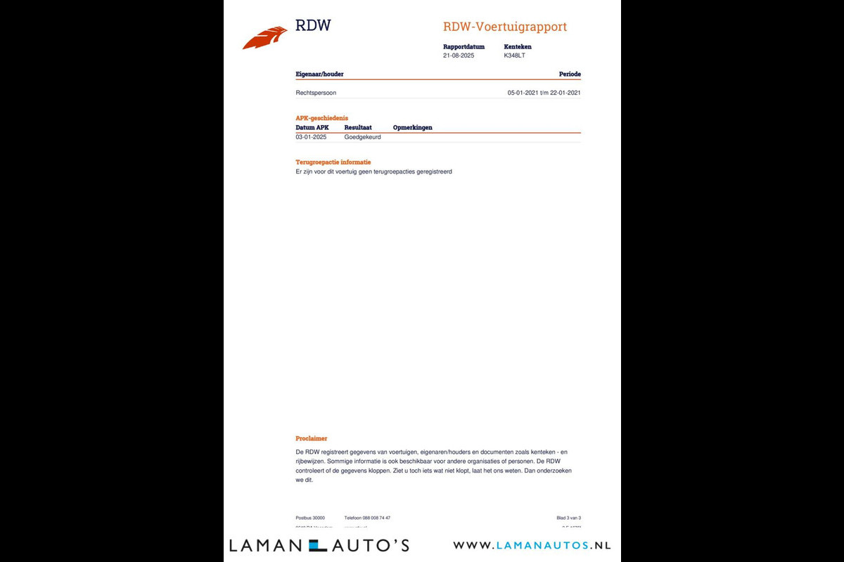 Deze advertentie en de inhoud ervan is met de grootst mogelijke zorg samengesteld. Het is echter mogelijk dat in de gehanteerde advertentietekst bepaalde opties en/of accessoires zijn vermeld welke niet op deze specifieke auto aanwezig zijn. Vraag voor aankoop naar de aanwezige opties en accessoires op de auto of bestelbus van uw keuze. Aan de getoonde informatie kunnen geen rechten worden ontleend en Laman Auto's kan nooit aansprakelijk worden gesteld voor de verstrekte informatie. Voor vragen en/of meer informatie over de exacte uitvoering en beschikbaarheid van de auto bel 06-52509973.