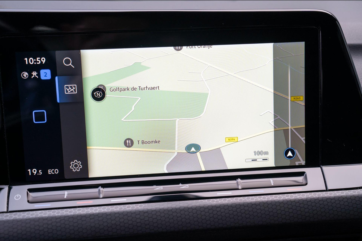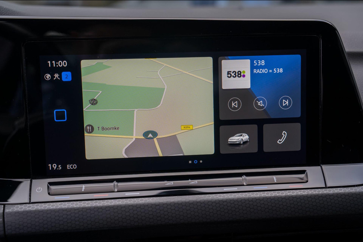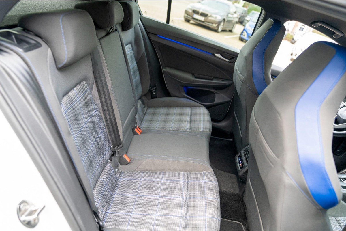 Super sportieve Volkswagen Golf GTE plug in hybride met navigatie, rode remklauwen, privacy glass en parkeersensoren rondom.