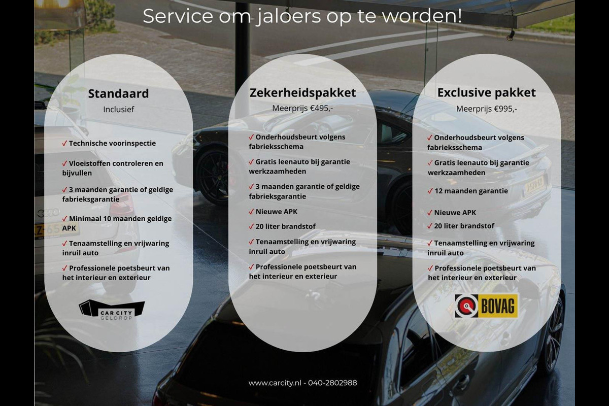 Dit afleverpakket bevat: BOVAG garantie (3 maanden); BOVAG 40-Puntencheck; - 3 maanden Car City garantie of resterende fabrieksgarantie, - Minimaal 10 maanden geldige APK, - Professionele poetsbeurt binnen & buiten, - Technische voorinspectie, - Tenaamstellen en vrijwaren inruilauto, - Vloeistoffen controle en bijvullen - Car City Zekerheidspakket (€ 495 meerprijs): Dit afleverpakket bevat (in plaats van afleverpakket "Standaard Afleverpakket"): BOVAG garantie (3 maanden); Geen BOVAG 40-Puntencheck; BOVAG Afleverbeurt; - 3 maanden garantie, - 20 liter brandstof, - Gratis leenauto bij garantiewerkzaamheden, - Nieuwe APK, - Onderhoudsbeurt volgens fabrieksschema, - Professionele poetsbeurt binnen & buiten, - Technische voorinspectie, - Tenaamstellen en vrijwaren